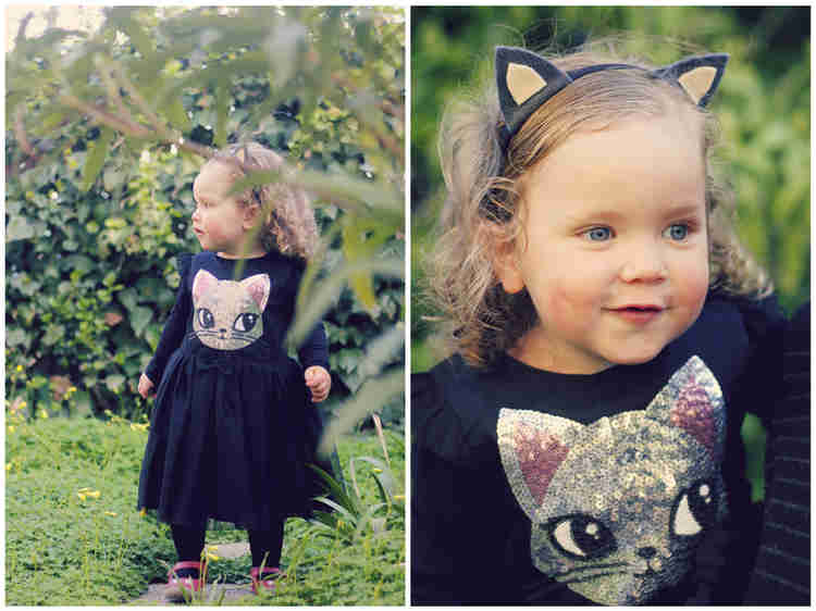 אז כמובן שזו ש"סובלת" מהמצב היא שוב הקטנה שבחבורה ובגלל שכבר היו לה נעליים מתוקות עם חתלתולות, ידעתי שאני רק צריכה למצוא אביזרים משלימים. המקום שאני הכי אוהבת לחפש בו "תחפושות" שכאלה הוא בH&M, ואכן לא התאכזבתי. שמלה שחורה וחגיגית עם פרצוף של חתולה חמודה מפייטים מנצנצים - מה צריך יותר מזה? מה שנשאר זה להוסיף חולצה וגרביונים שחורים וקשת עם אוזניים. אפשר לקנות כמובן, אבל משוגעת כמוני חייבת להרגיש שהיא הכינה את התחפושת בעצמה, ולכן הכנתי בחמש דקות קשת תוצרת בית. תראו איך שהגברת נכנסה לתפקיד! במשך כל הניסיונות שלי לצלם את השובבה הזו היא לא הפסיקה לשחק עם החתולים שהתרוצצו סביבנו בחצר. כנראה שהיא הרגישה שיש להם משהו במשותף :)